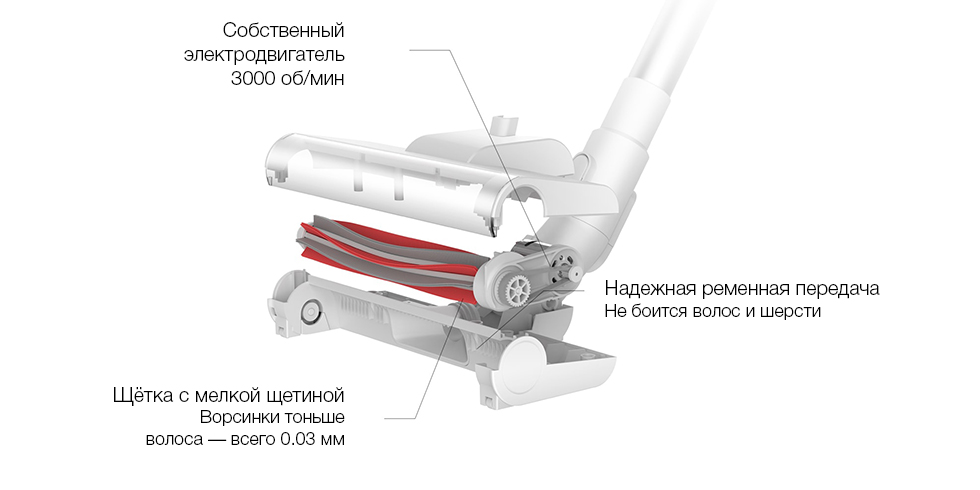 У щетки пылесоса есть собственный электропривод, обеспечивающий ей вращение со скоростью 3000 об/мин. Такая скорость работы позволяет глубоко проникнуть в мельчайшие щели паркета или вглубь ковра, откуда мягкая щетина уберет пыль, при этом не навредив покрытию.