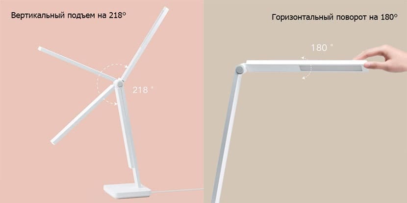 Настольная лампа Mijia Lite оснащена поворотным шарниром, который можно поднять на 218°, а также саму лампу можно повернуть на 180°.