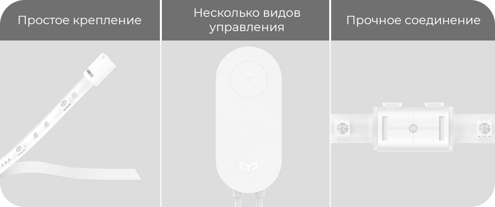 Элементарное крепление: удалите защитную пленку клеящегося слоя и поместите ленту в желаемом месте. Управление одной кнопкой. Короткое нажатие – включение и выключение, длинное нажатие – изменение цвета. Контрольный щелчок. Звук щелчка даст понять, что Вы надежно соединили основную ленту с удлинителем.